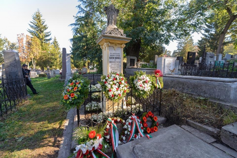 A finom gulyás illata mindenkit kicsalogatott a szobájából, így a több mint 70 főre előkészített asztalok és padok roskadásig teltek. A jó hangulatú estét szombat délelőtt folytattuk. A Kollégiumtól együtt sétáltunk a Marosvásárhelyi Református Temetőkertbe, ahol kezdetét vette az ünnepség, megemlékeztünk névadónkról, a 250 éve született dr. Gecse Dánielről. Az áhítat, köszöntőbeszédek, szavalatok, kórusművek, áldás meghallgatása utána dr. Gecse Dániel síremlékéhez vonultunk, tiszteletünket pedig koszorúkkal fejeztük ki. Ezt követően meghívott vendégeinkkel közösen a Kollégium nagytermében állófogadásunk vettünk részt.