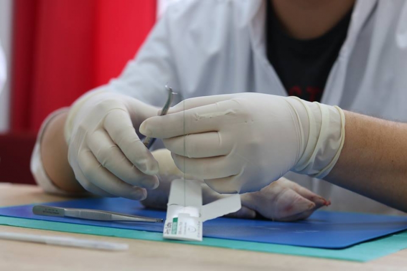 Rövid szünet után folytatódott az oktatás, a résztvevők megtanulták a varratszedés alapelveit, a steril kesztyű helyes felvételét, a sziketartási módokat, a csipesz, olló és tűfogó helyes tartását, az eszközös (apodaktíliás) csomózást, majd következett a varrástechnikák disznólábakon való gyakorlása. Összesen nyolcféle öltéstípust gyakoroltunk, az egyszerű csomós varrat, vertikális matrac varrat (Donati), Allgöwer-varrat, horizontális matrac varrat, X-varrat, egyszerű tovafutó varrat, megakasztott tovafutó varrat (Ford), valamint az intracutan tovafutó varrat elkészítését.